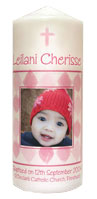 "The candles did arrive today, and as you predicted, they are absolutely divine! I couldn’t be happier. The main candle is just beautiful – that shot of Grace works perfectly! I hope the candle lasts forever! And the taper candles look lovely, and I think they’ll be a great memento for the godparents. I wouldn’t hesitate to recommend your service to anyone…and I’ll be letting everyone in my Mother’s Group know about it! Thank you once again."